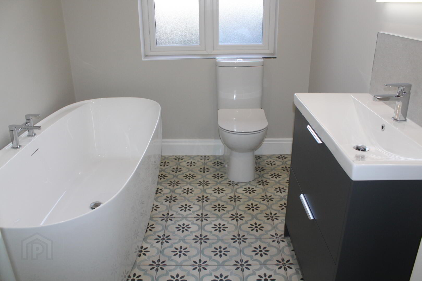 Bathroom: 3m x 2m Modern white suite comprising Bath, Shower, Wash Hand Basin, Wc. Tiled floor.