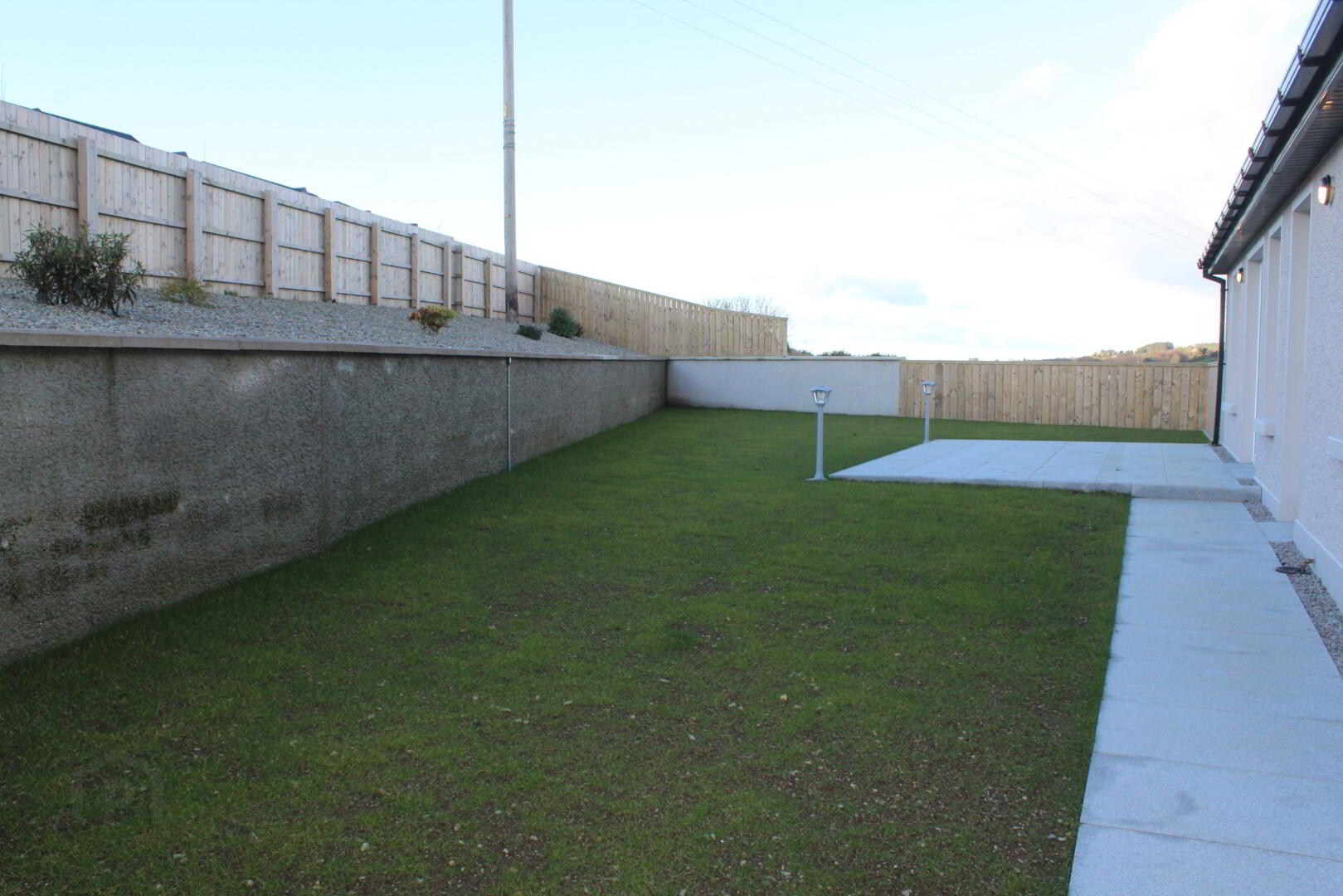 Lawn areas sowed out with grass seed. Timber fencing.