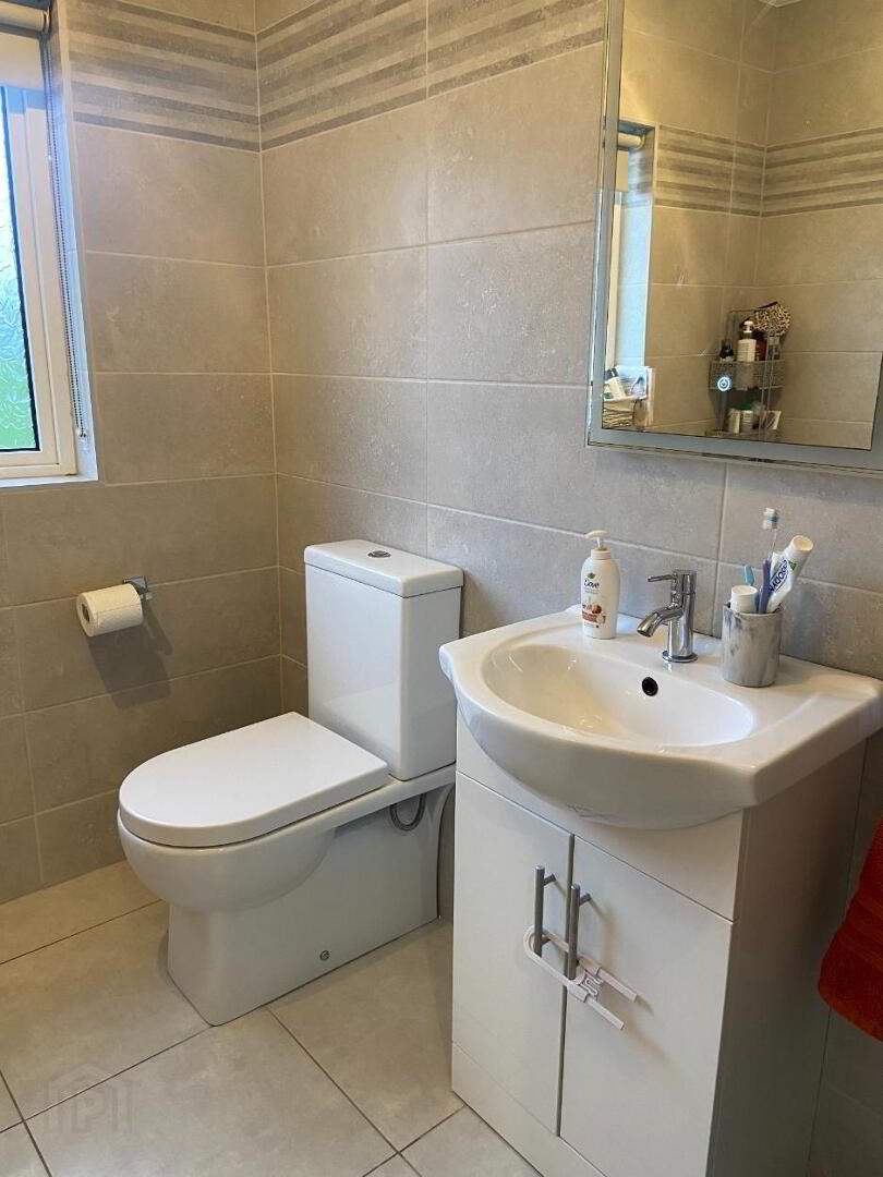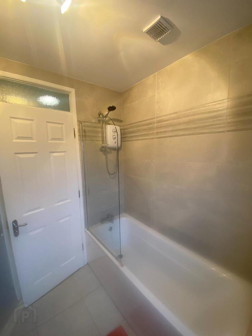 BATHROOM: White suite comprising pedestal wash hand basin, Wc, Shower over bath. Tiled floor and walls. Radiator.
