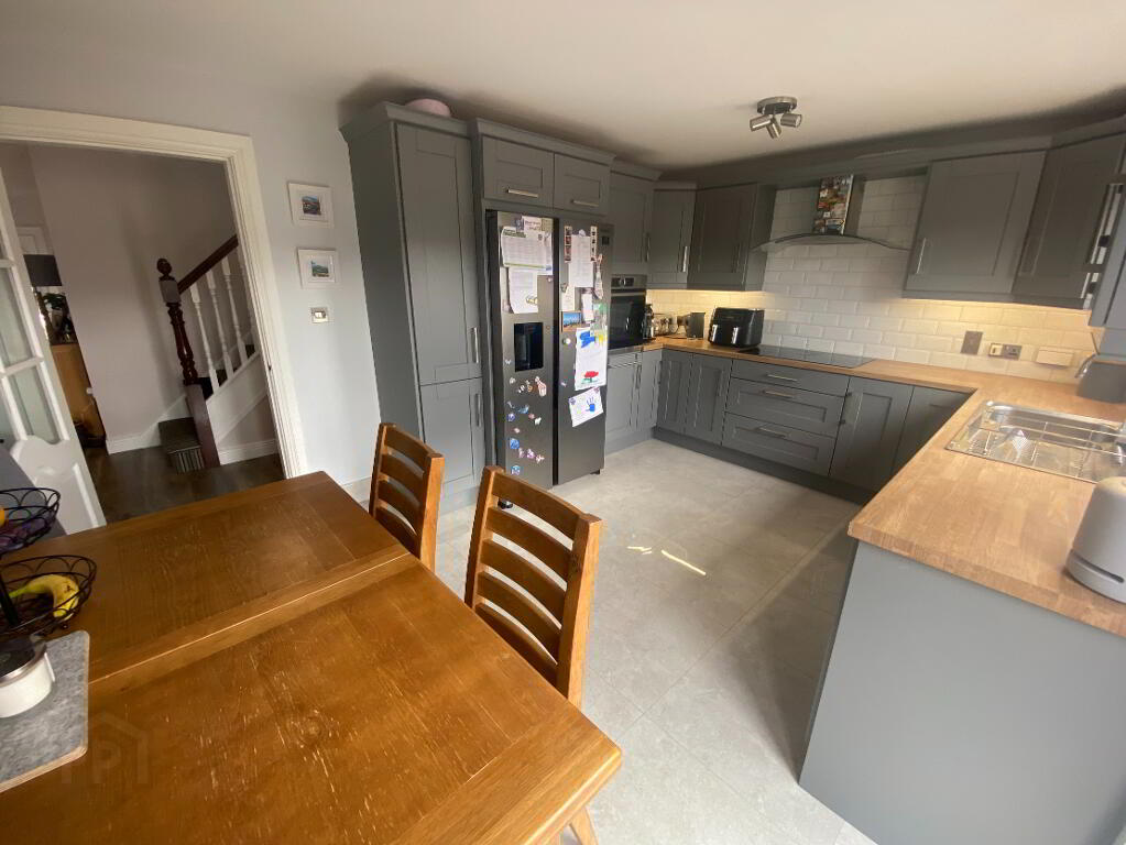 Good range of modern fitted kitchen units with integrated appliances to include dishwasher, 'Neff' 5-ring electric hob, 'Bosch' oven, and stainless-steel 1 1/2 tub sink unit. Tiled floor. Double radiator. Pvc double patio doors to timber raised decked area offering spectacular views towards the Cooley mountains.