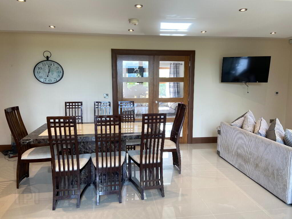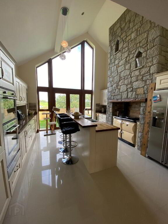 Kitchen/Dining Area: 7.719m x 8.234m @Widest Point. Antique Cream Fitted Units with Brown Marble Speckled Worktop. Integrated 'Stanley' Aga-style Cooker. Stone featured Chimney Wall, with Railway sleeper Mantle. Integrated Microwave and Oven. Island unit with storage. Belfast Sink with double drainer sink unit. Spotlighting. Mahogany Butcher Block Worktop. Larder Cupboard with shelving and drawers. Partially tiled walls. Marble Brown Border trim. Porcelain Cream Tiled floor. Floor to Ceiling Patio Doors and glazed panels leading to rear Garden area.