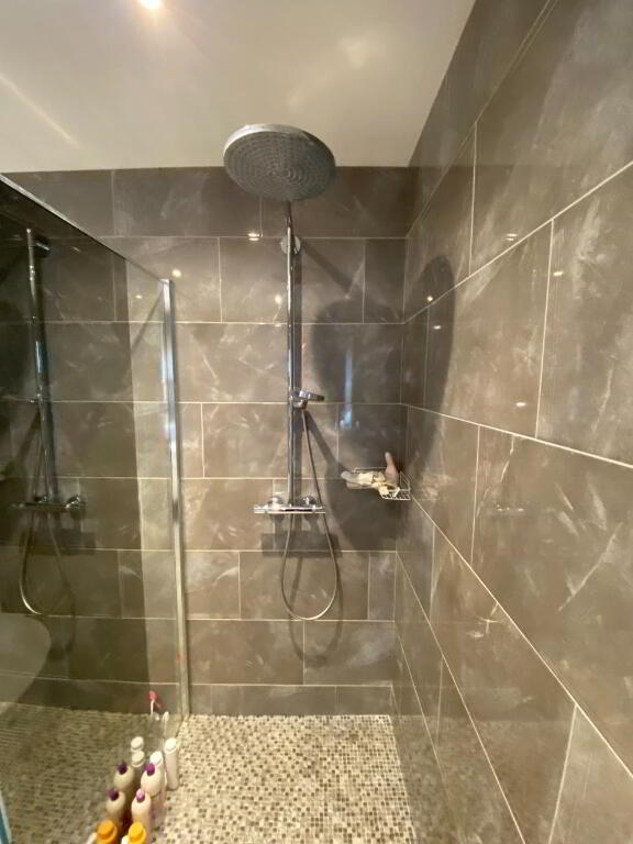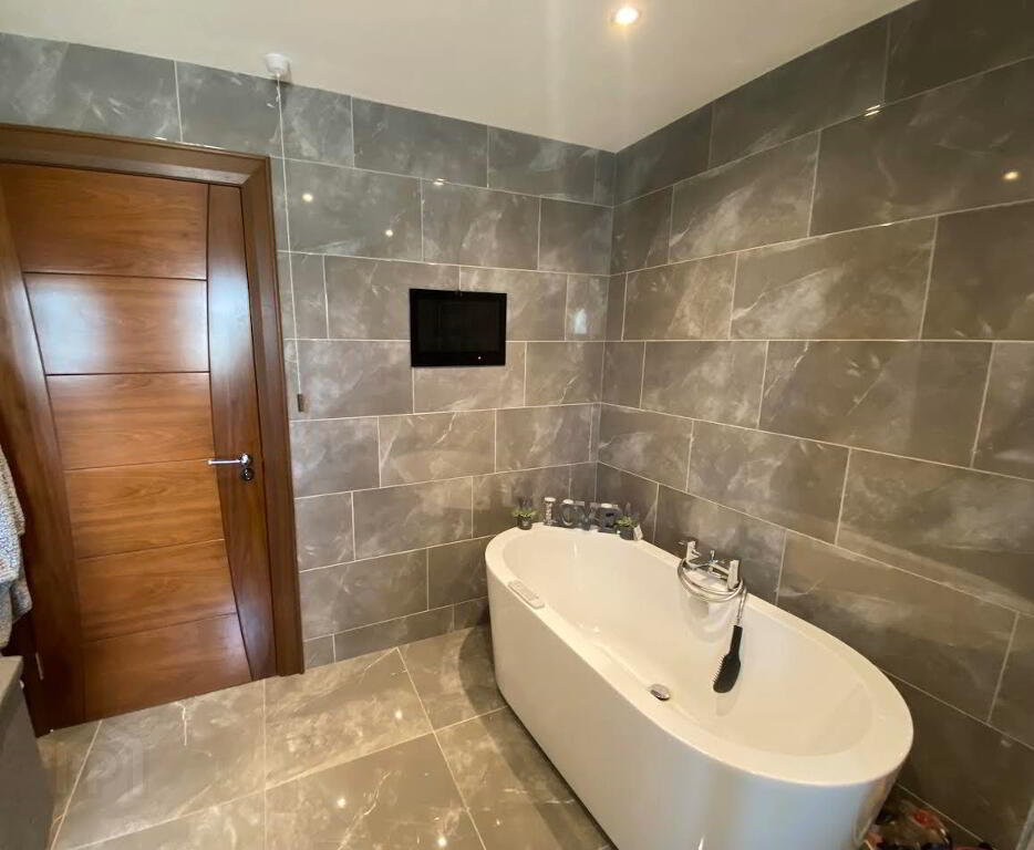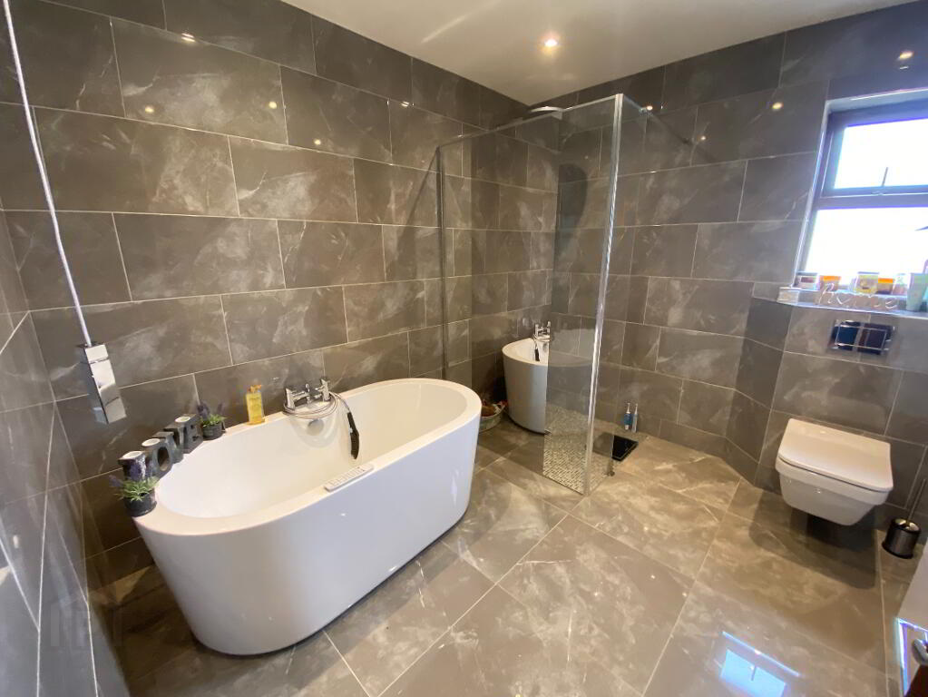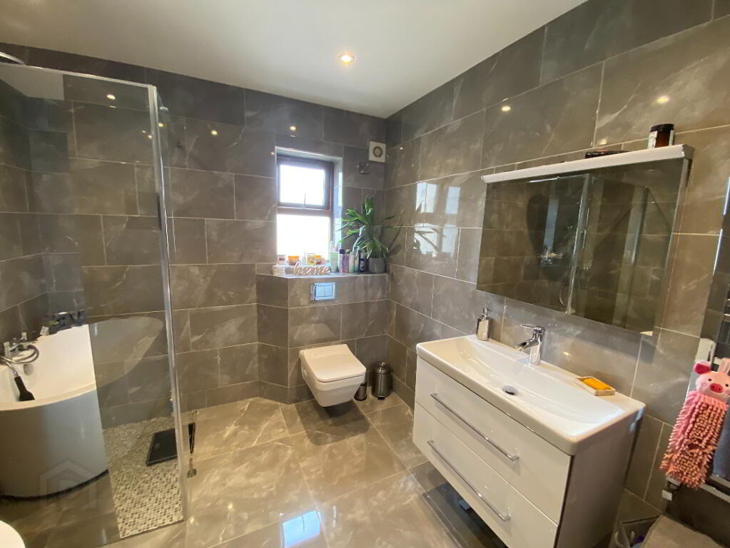 Bathroom: 2.959m x 2.770m. Four-piece white suite comprising Low Flush WC, Wall hang Wash Hand Basin with built-in vanity unit, bath unit with handheld shower head large walk-in shower with rainfall shower head. Heated towel rail and radiator. Extractor Fan. Spotlighting. Fully Tiled walls and floor. Power Shower.