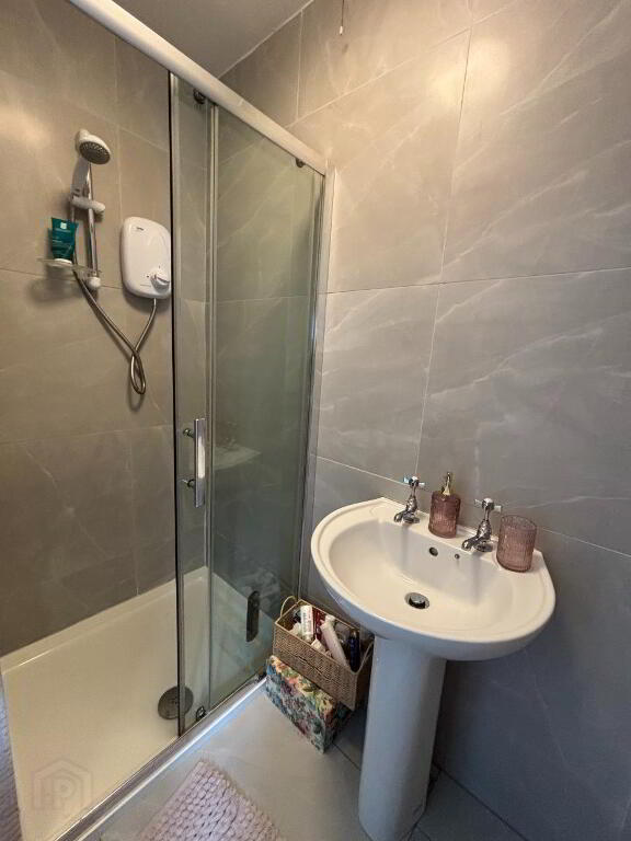 ENSUITE SHOWER ROOM Walk in shower cubicle, 'Mira' electric shower, wash hand basin, low flush WC, tiled floor, tiled walls.