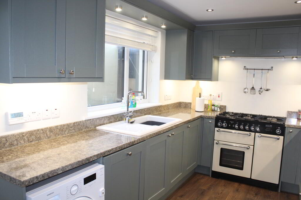 Kitchen – 4.6m x 2.5m Range of Modern high and low level fitted kitchen units. Recessed extractor fan. Integrated 'Beko' Dishwasher. Integrated fridge/freezer. Wall mounted radiator. Tiled floor. recessed spot lights.