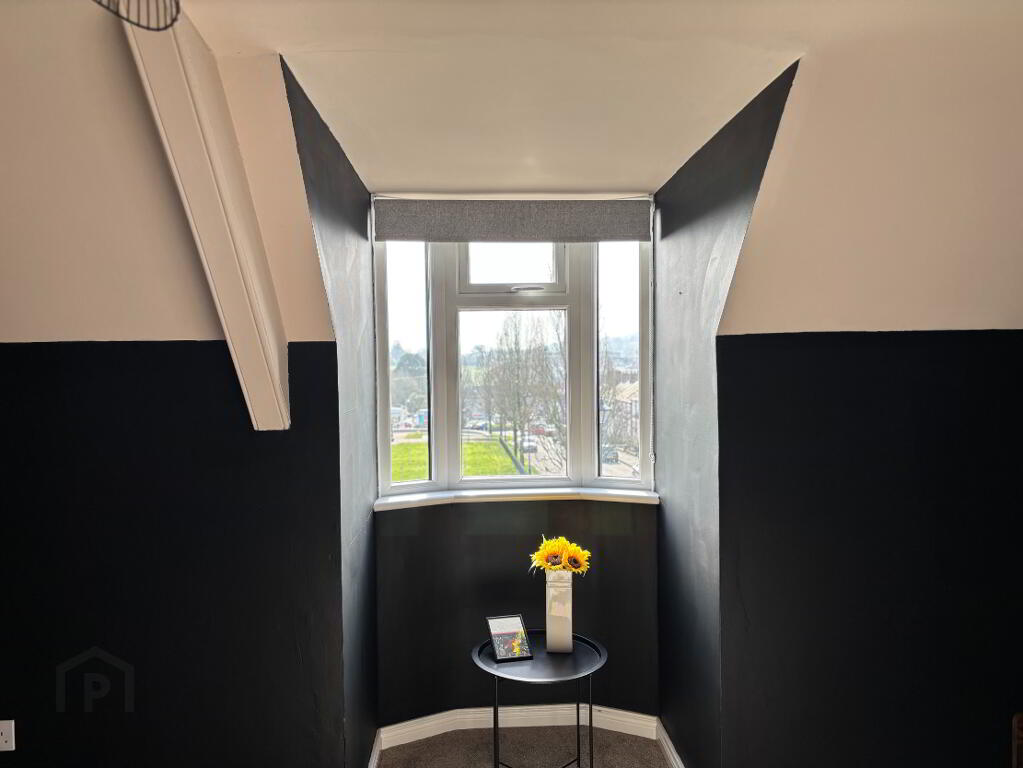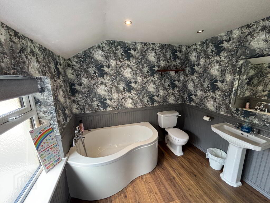 Family Bathroom: 2.7m x 2.5m. Traditional style white suite comprising curved corner bath, pedastal wash hand basin, Wc, enclosed shower cubicle with 'Mira' electric shower rainfall shower head and smaller lightweight handset, tiled floor, part wall paper & part timber paneled walls. Recessed spot lights. Hotpress with Gas Boiler (last service date 29th October 2025).