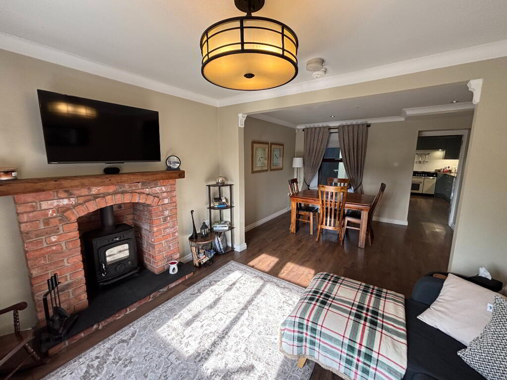 Lounge/Dining Room: 6.0m x 3.8m Brick Fireplace with wood burning stove. Walnut laminated flooring. Two radiators.