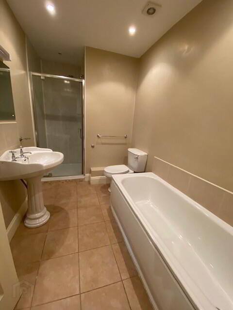 Tiled floor. Pvc panelling to bath and shower areas.