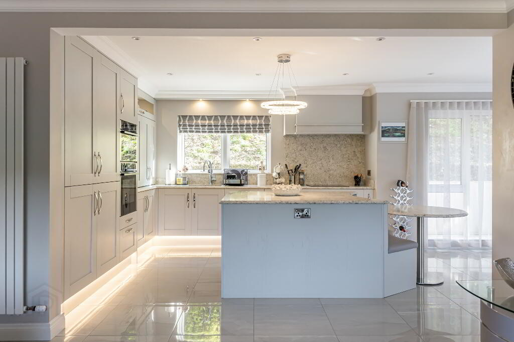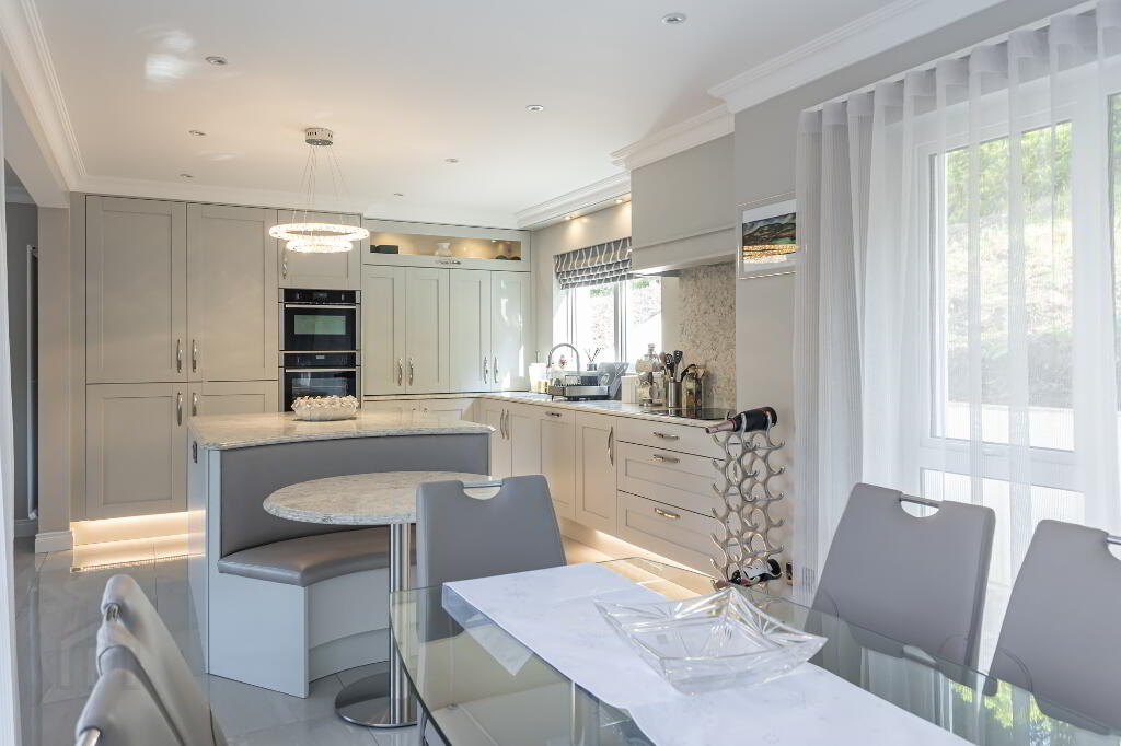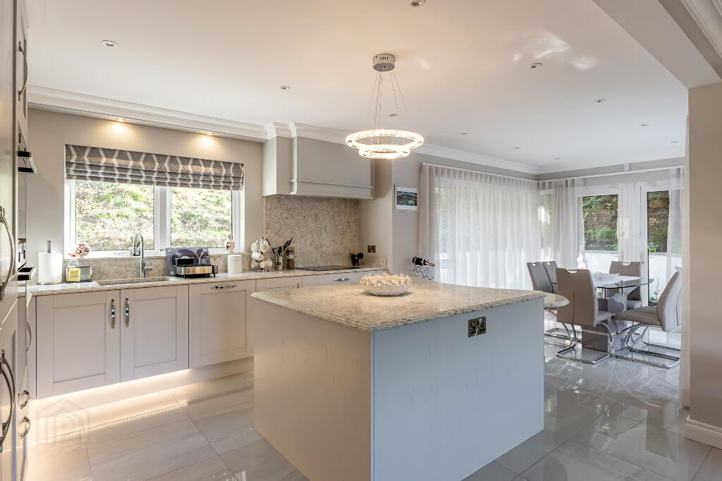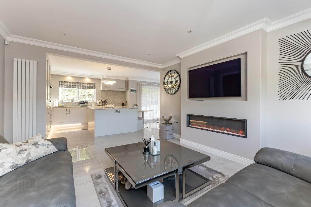 Kitchen/Dining/Living area – open plan with modern high and low level kitchen units, feature centre island, granite work tops, integrated fridge freezer, underfloor heating, electric fire, pull out pantry, island with wine chiller, children’s seating booth.